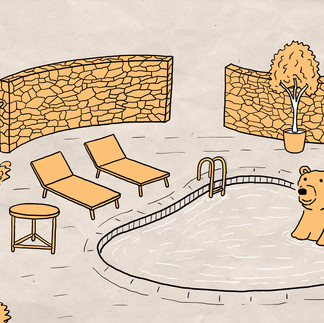 Es justo esto lo primero que llama la atención de esta producción. La forma en que Musser consigue, desde los primeros segundos de la cinta, convertir la cámara en una presencia paciente y, a nosotros, en los testigos discretos de lo inesperado. Vemos a los osos caminar entre macetas, explorar senderos domésticos, descansar bajo árboles frutales. Cámaras solitarias los registran desplazándose por jardines, cruzando cercas, sumergiéndose en piscinas. La propuesta se siente íntima y observacional, como si el espectador hubiera sido invitado a sentarse a cierta distancia y aprender a mirar de nuevo. Pronto el cortometraje alterna estas imágenes con animaciones fluidas y coloridas.